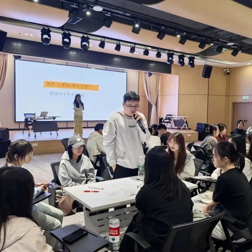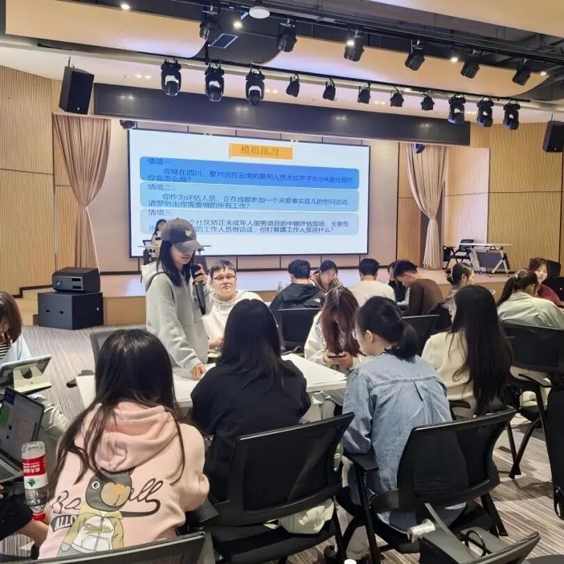 培训的收尾环节,以实战模拟的形式检验学习成果。学生们分别扮演 “项目执行者” 与 “评估人员”,围绕人员回访、评估访谈等贴近实际工作的场景,分组完成三个情境的模拟练习。在模拟过程中,学生们灵活运用课堂所学的流程与方法,解决场景中的问题,不仅加深了对项目评估的理解,更在实践中提升了技能的综合应用能力。