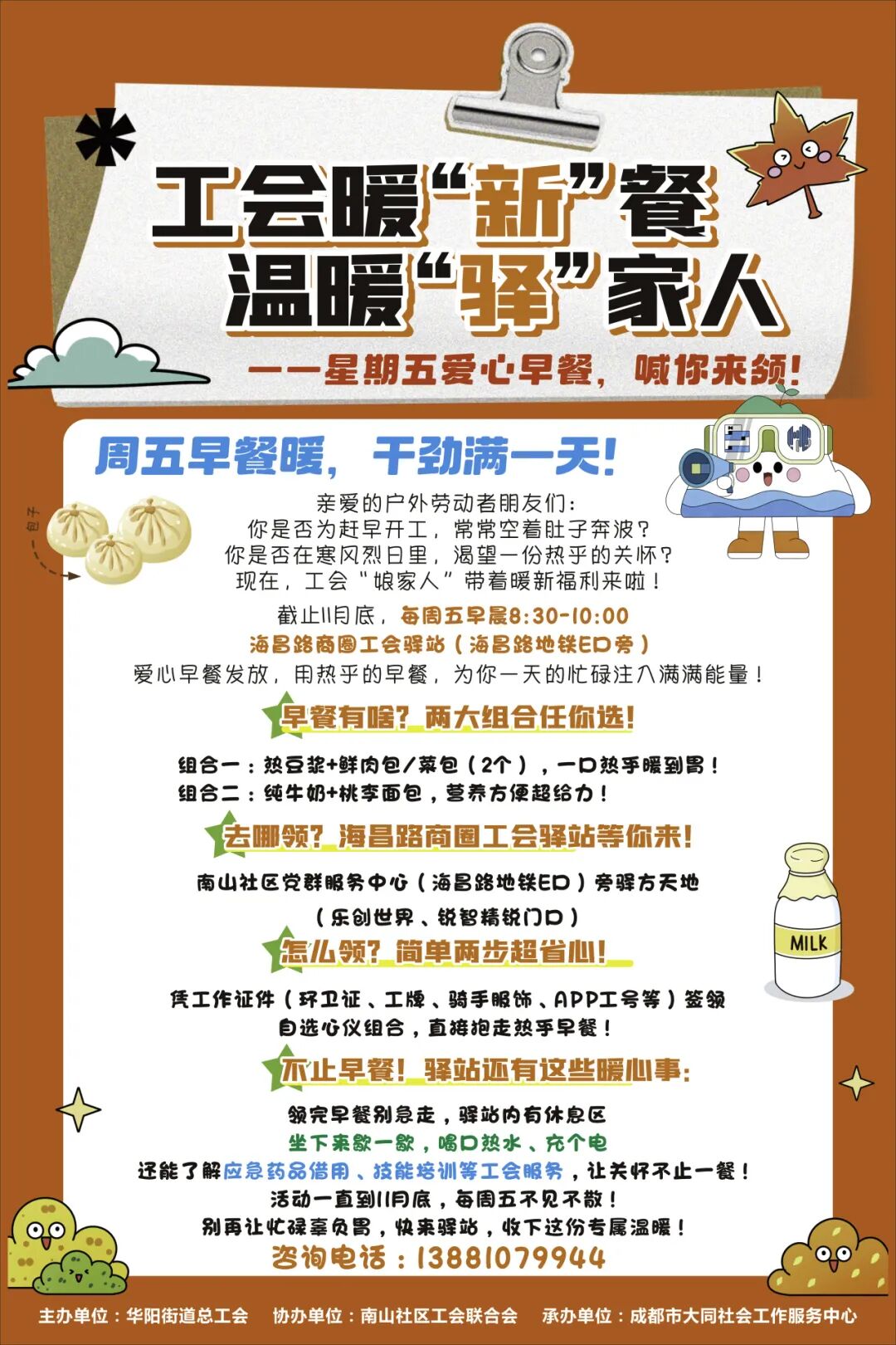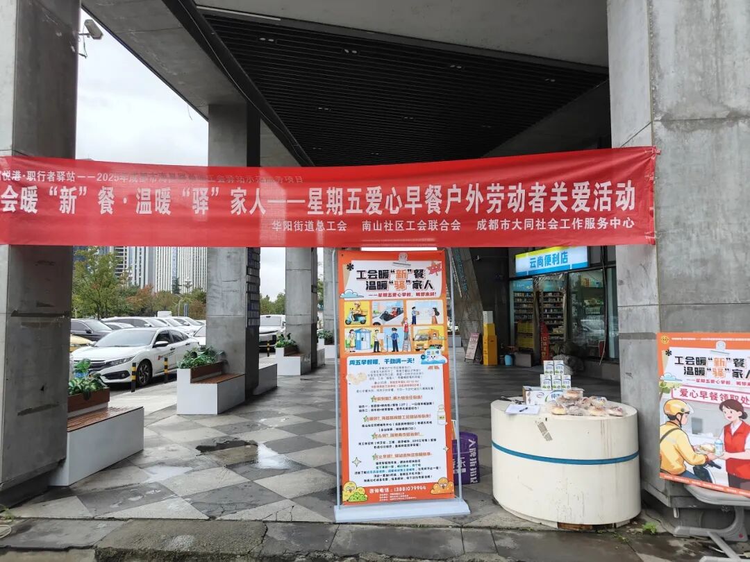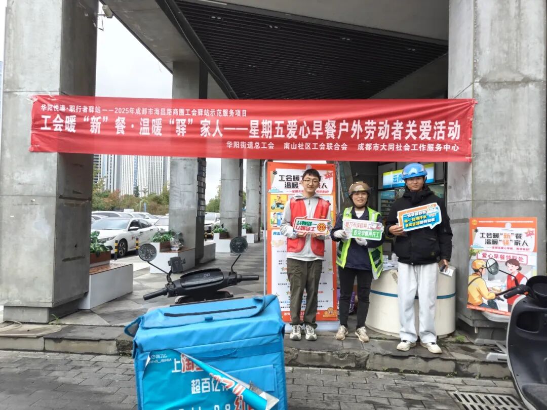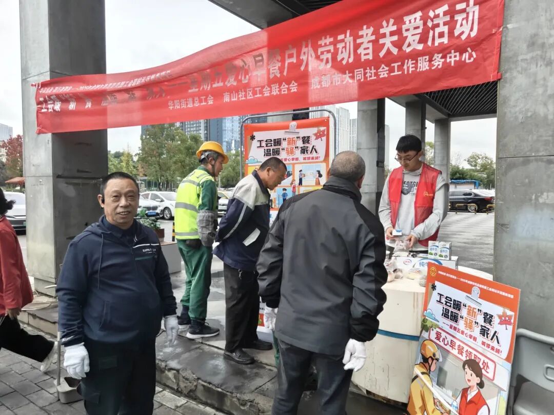 为切实解决户外劳动者早餐难问题,传递工会娘家人的温暖,华阳街道总工会联合南山社区工会联合会、成都市大同社会工作服务中心特开展工会暖“新”餐・温暖“驿”家人星期五爱心早餐活动,以固定化、常态化的早餐服务,为户外劳动者补充能量,让其在清晨感受到社会关怀与职业尊重,增强其城市归属感与幸福感。