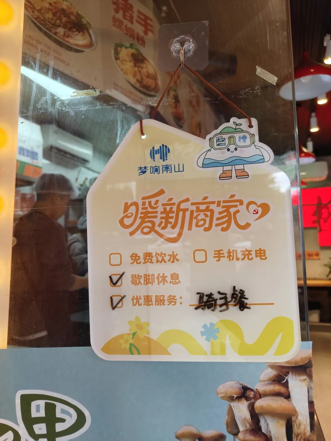 活动伊始,工作人员按商圈区域分组,带着定制暖新商家标识牌、暖新商家服务需求表上门走访。与商家共同确定标识牌悬挂位置——既保证显眼易见,又不影响日常经营;同步引导商家填写核心义务清单,明确免费饮水、手机充电、临时休息等服务内容。走访中,工作人员细致收集商家痛点,如部分商家反映不知晓办证联系人等日常问题,也记录下商家可共享的额外资源,如可提供义诊、骑手餐、可参与社区志愿服务等。灵活的上门形式拉近了距离,让商家反馈更真切、交流更放松。