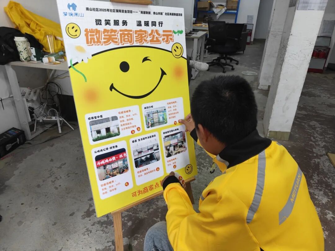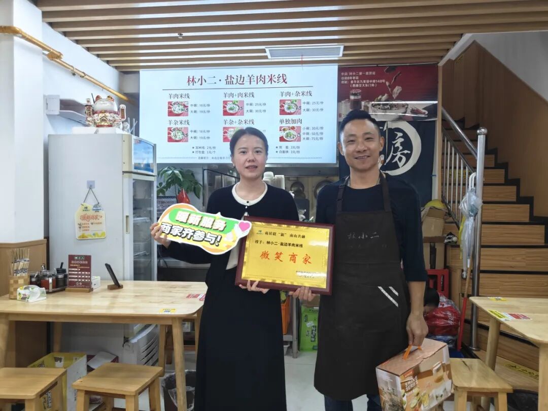 为关怀新就业群体、助力商户提升服务品质,搭建社区、商户、居民与新就业群体间的情感桥梁,2025年9月至10月,南山社区以“微笑服务,温暖同行”为主题,在社区辖区内开展微笑商家评选活动。活动通过筹备-招募-公示-授牌全流程联动,将微笑服务理念融入社区服务细节,切实营造理解、尊重、关爱的社区氛围。