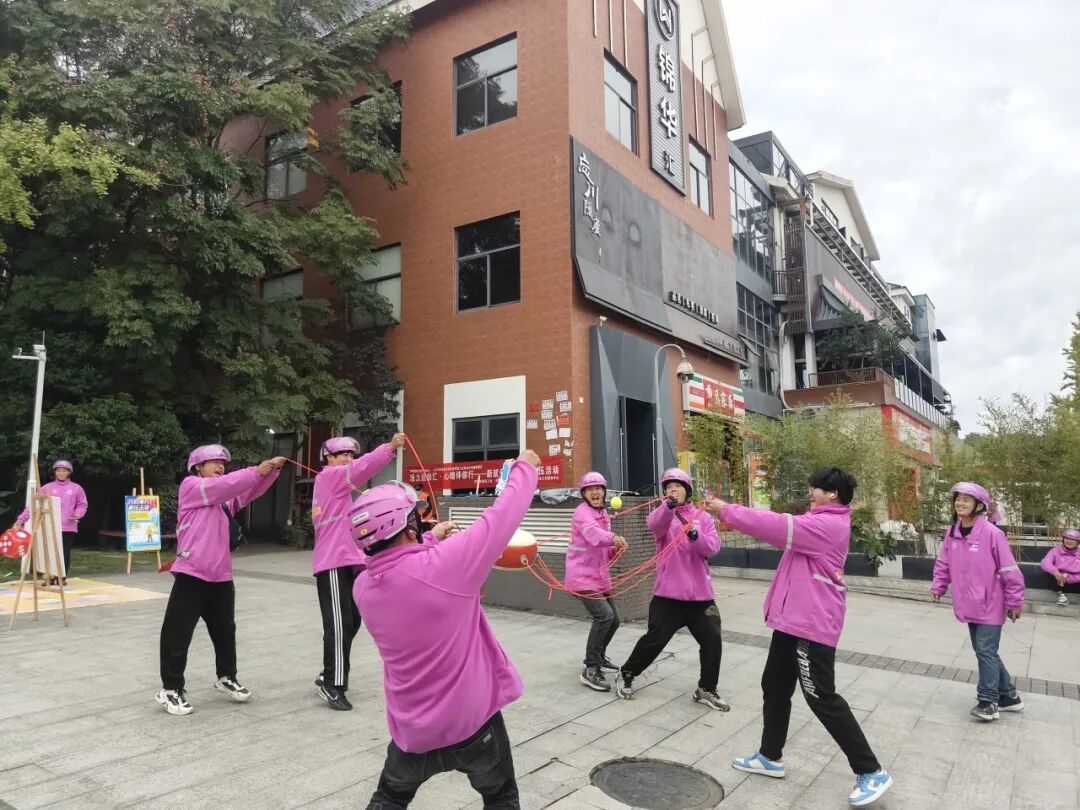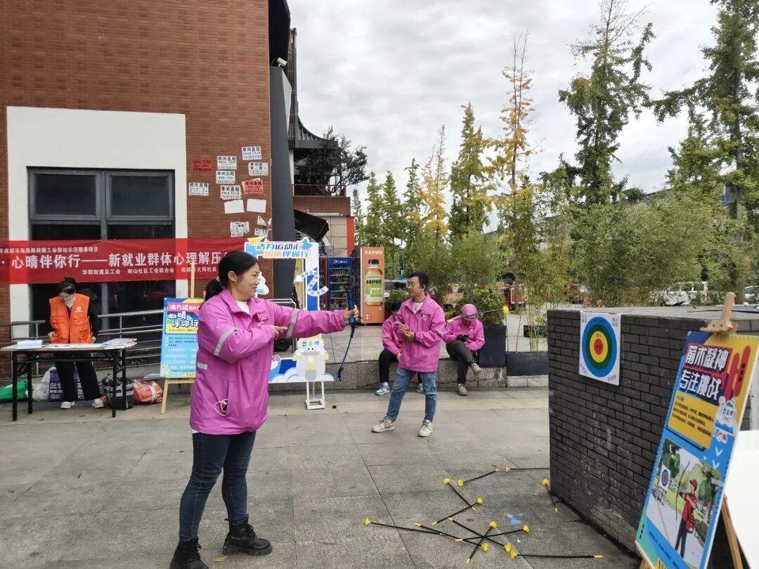 箭术凝神·专注挑战、古韵捶丸·解压击球各个体验环节中,配送员们集中注意力,瞄准箭靶或球洞调整呼吸、专注发力,在一次次击打过程感受目标聚焦的解压效果。当球成功入洞时,现场不时响起欢呼声,这份成就感让大家更深刻理解设定小目标缓解压力的道理。而趣味飞行·快乐闯关体验作为全员参与项目,更是将氛围推向高潮。巨幅飞行棋地毯上,大家轮流投掷骰子,踩到心理任务格时便集体完成学小动物叫、分享开心小事等任务,“顾客给的一瓶水”“与好友互相拥抱”等温暖分享,让现场充满温情。
