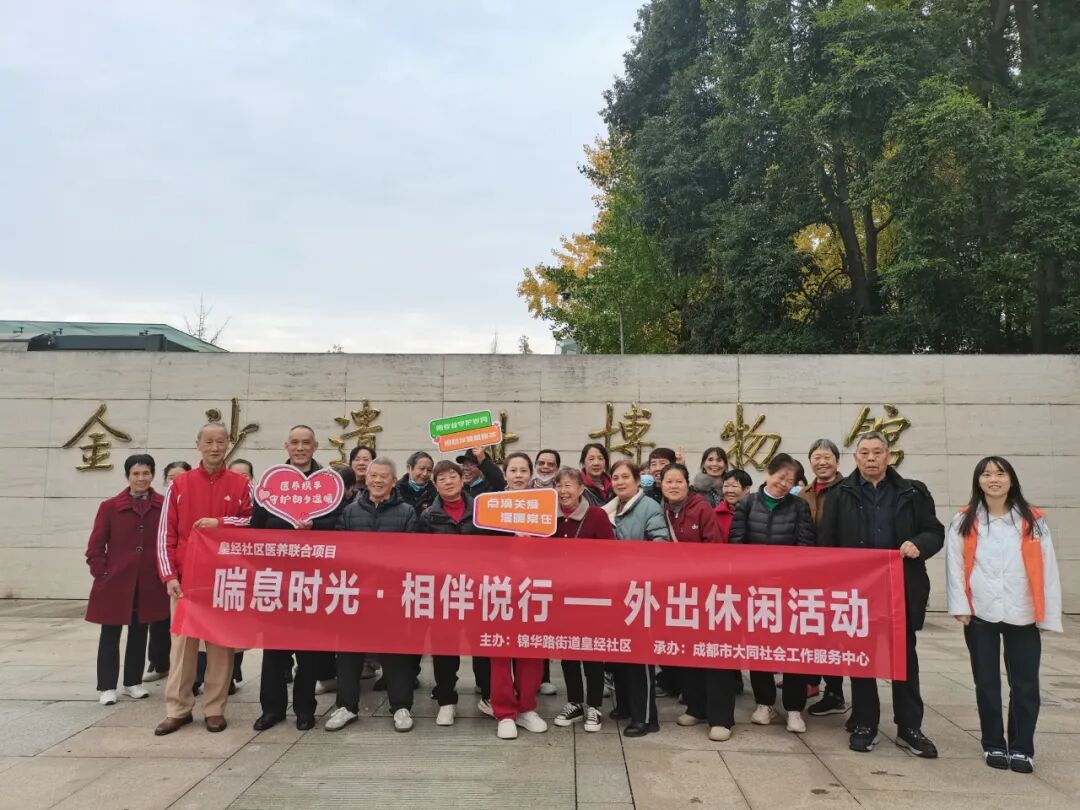 为切实关爱社区居家照护者群体,有效缓解其长期照护带来的身心压力,丰富精神文化生活,让照护者们拥有专属的放松与休闲时光,2025年11月18日,在锦华路街道皇经社区的大力支持下,成都市大同社会工作服务中心开展喘息时光・相伴悦行——外出休闲活动区,组织辖区居家照护者前往金沙遗址博物馆开展文化参观活动,旨在通过文化浸润传递社区温暖,增强照护者群体的幸福感与归属感。