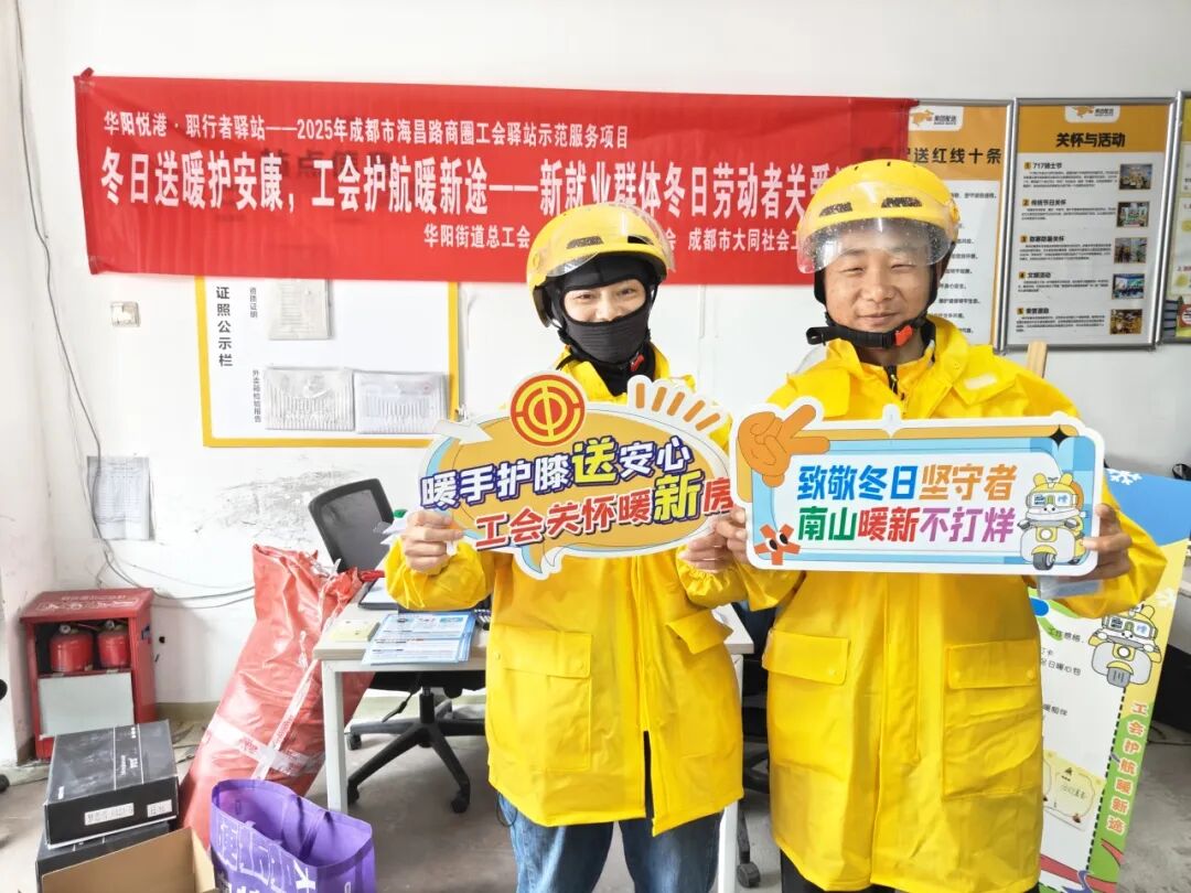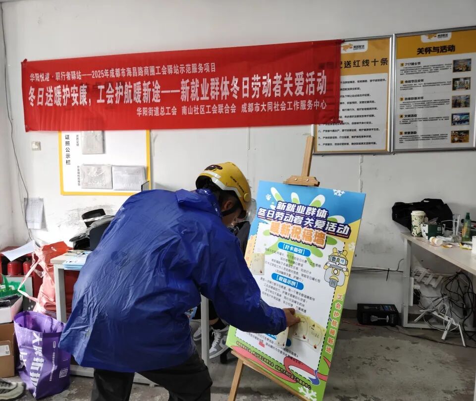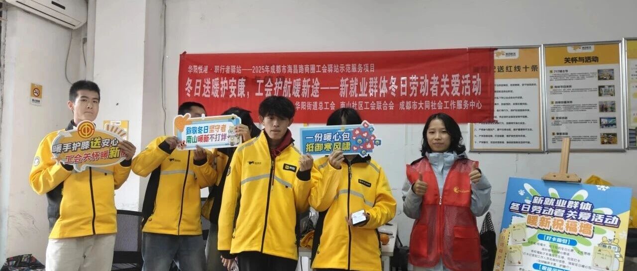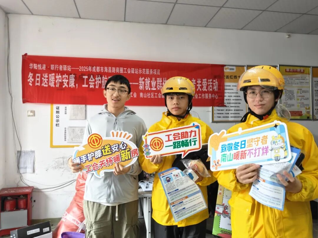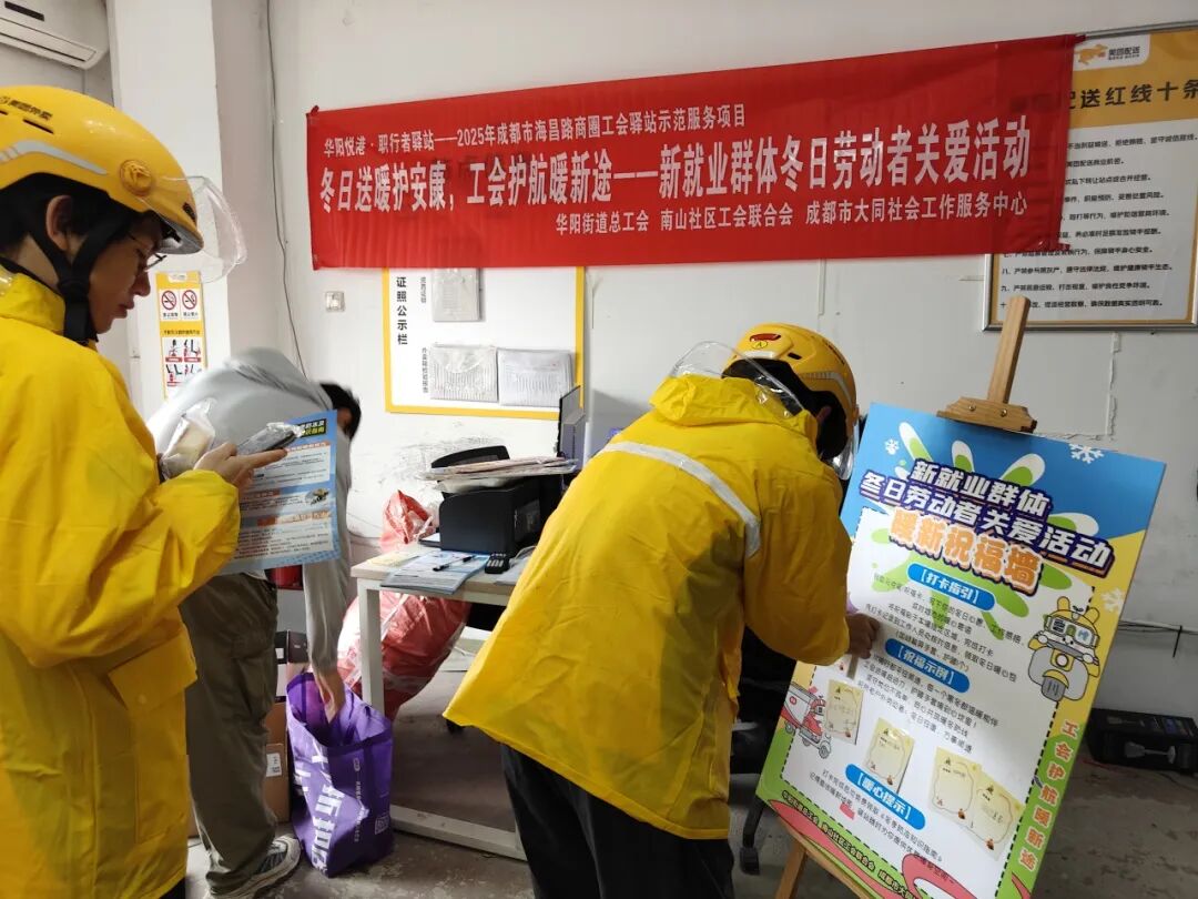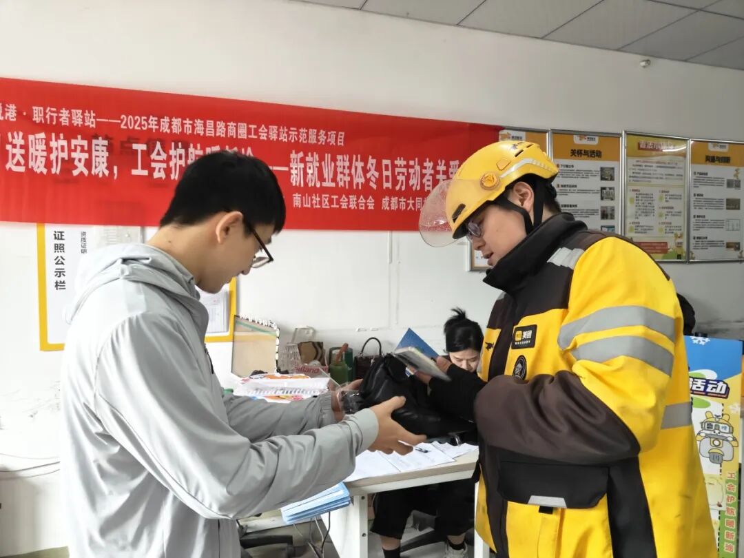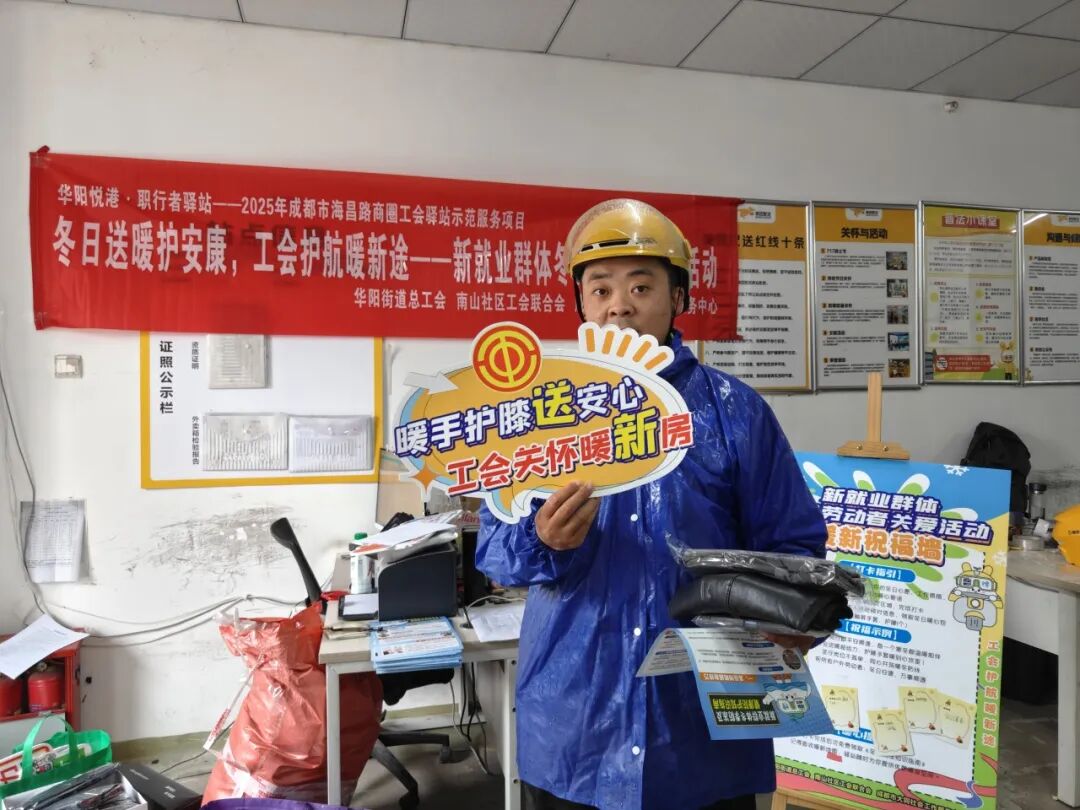为切实解决新就业群体冬季户外工作保暖需求,传递工会与社区的暖心关怀,增强其职业幸福感与社会归属感,2025年10月31日,华阳街道总工会联合南山社区工会联合会、成都市大同社会工作服务中心开展“冬日送暖护安康,工会护航暖新途”新就业群体冬日劳动者关爱活动。活动以保暖物资精准发放、保暖休息区引导、防冻知识宣传为核心,为户外奔波的新就业群体筑牢冬日温暖防线,吸引50余名新就业群体参与。