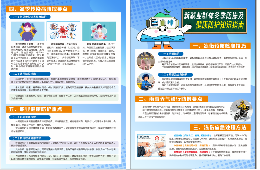 活动前期,筹备团队围绕新就业群体高频诉求,精心采购适配户外工作的实用保暖物资,将加绒保暖触屏手套与护膝打包成冬日暖心包,确保物资兼具保暖性、防水性与实用性;同步展示南山社区“暖新地图”,清晰标注海昌路商圈工会驿站、驿方天地等保暖休息区点位及核心服务;编写《新就业群体冬季防冻及健康防护知识指南》宣传单,涵盖冻伤预防、雨雪天骑行防滑、应急处理等实用知识,为活动顺利开展筑牢基础。